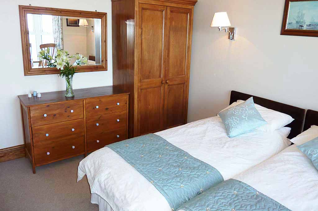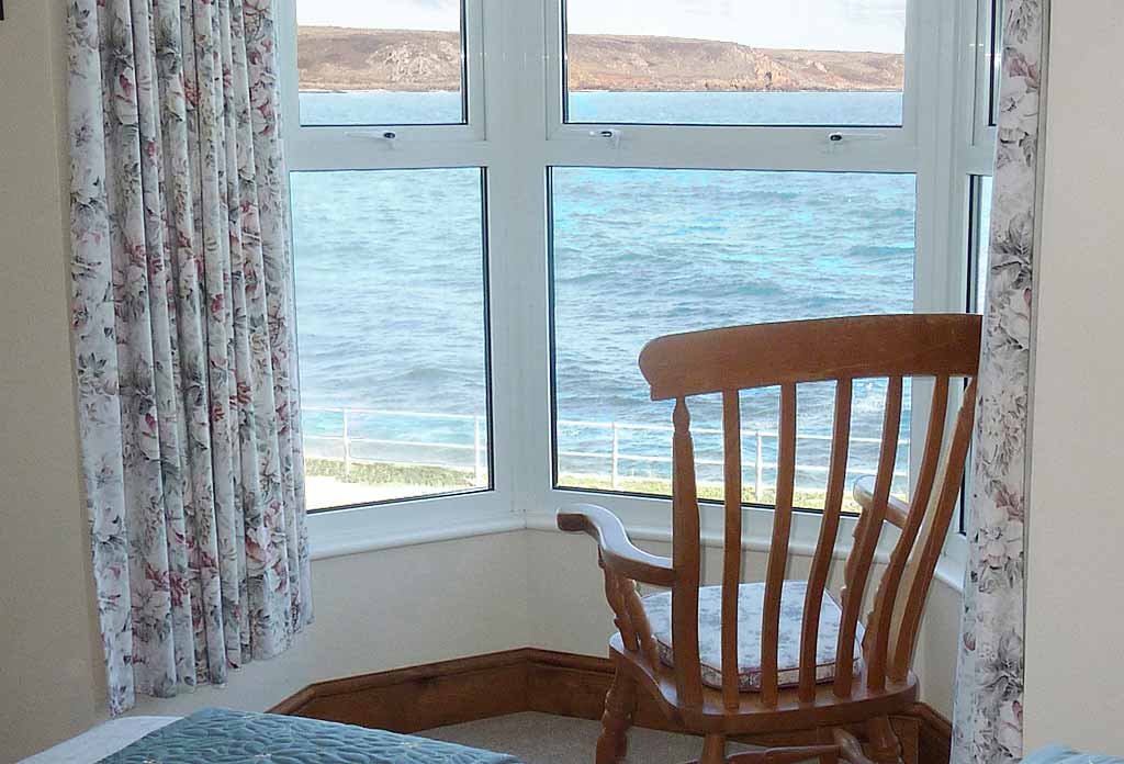 Twin beds, wardrobe, chest of drawers, flat screen tv, window chair with stunning views of Sennen beach, the bay and the ocean beyond. There's an en suite shower room with walk-in shower, wc, wash-basin, shaver point and heated towel rail.
